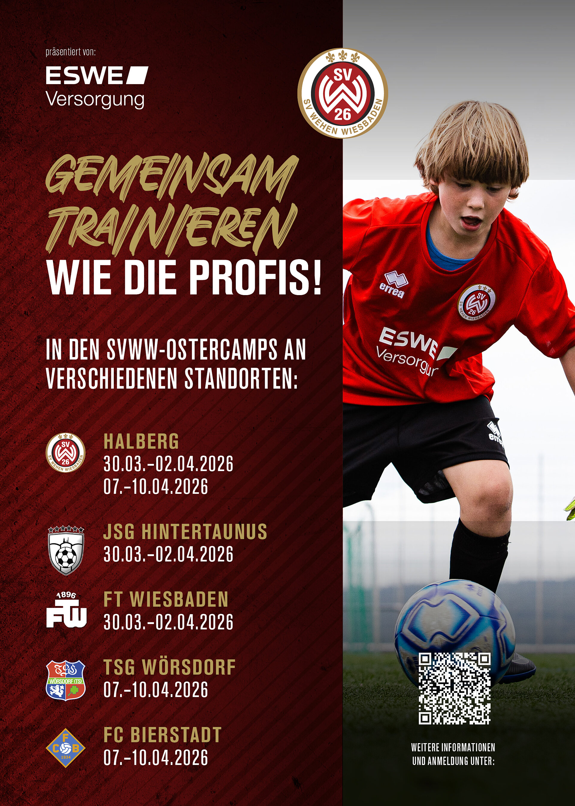 Nicht mit uns! Hier bieten Dir die SVWW-Fußball-Feriencamps präsentiert von der ESWE Versorgungs AG die volle Packung Fußballspaß an. In allen Ferienwochen und an ausgewählten Standorten kannst Du im Rahmen der jeweiligen Kurse neue Freunde finden und coole Tricks erlernen. Wenn Du ein Camp in Wehen auf dem Halberg buchst, trainierst Du im SVWW-Trainingszentrum nur einen Steilpass von unseren Profis entfernt.