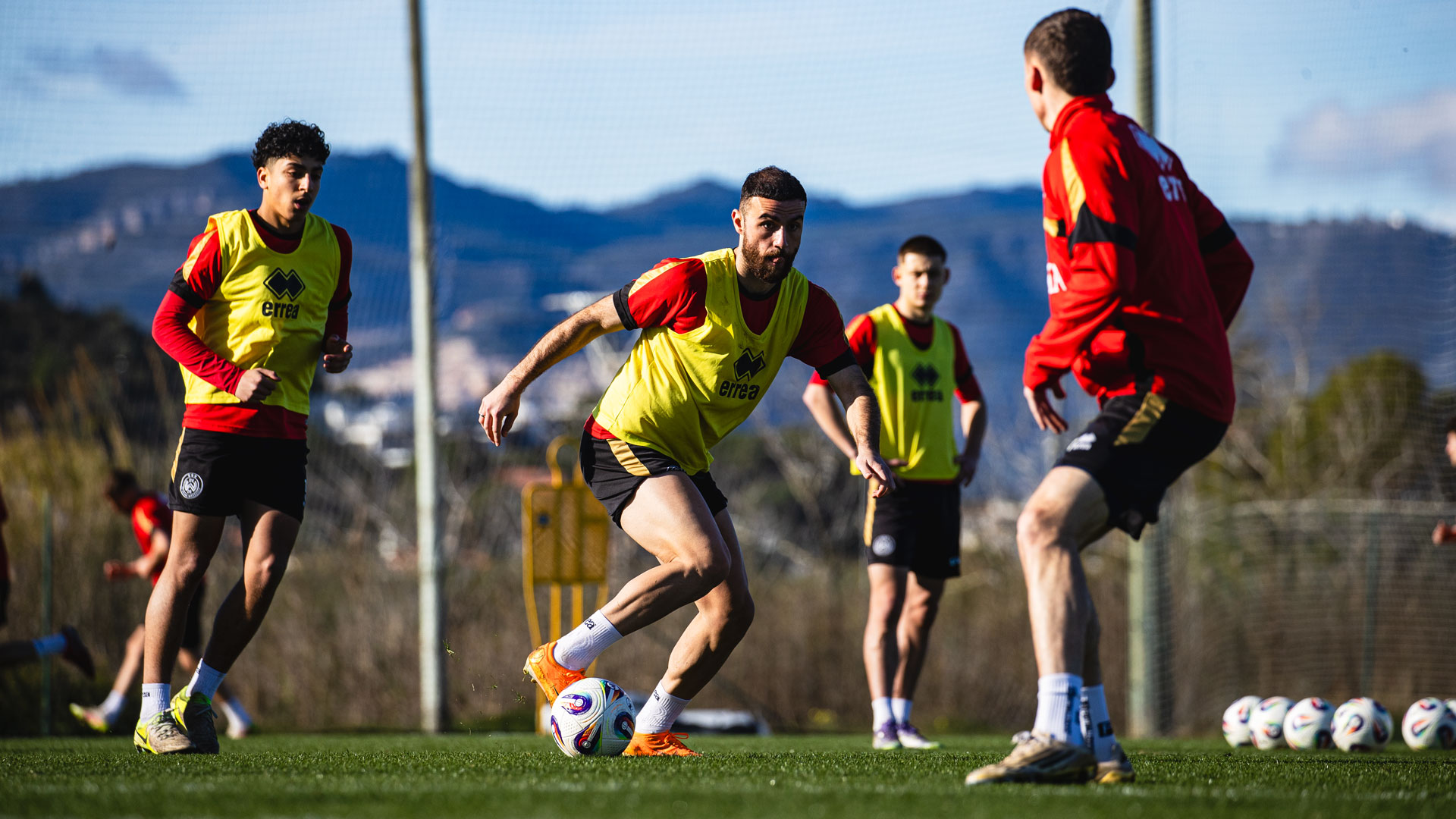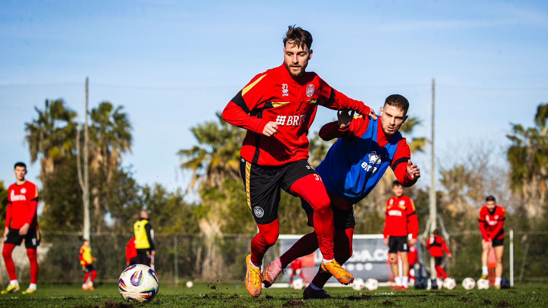Kurz nach dem Mittagessen stand direkt die erste gemeinsame Trainingseinheit des neuen Jahres auf einem der nahegelegenen Plätze an. Die rund 75-minütige Einheit, die von mehr als 20 Fans der Rot-Schwarzen mitverfolgt wurde, konzentrierte sich dabei vor allem auf Passübungen und erste Spielformen. Bei angenehmen 15 Grad herrschte nur zu Beginn des Trainings ein leichter Nieselregen, der sich schnell verzog.